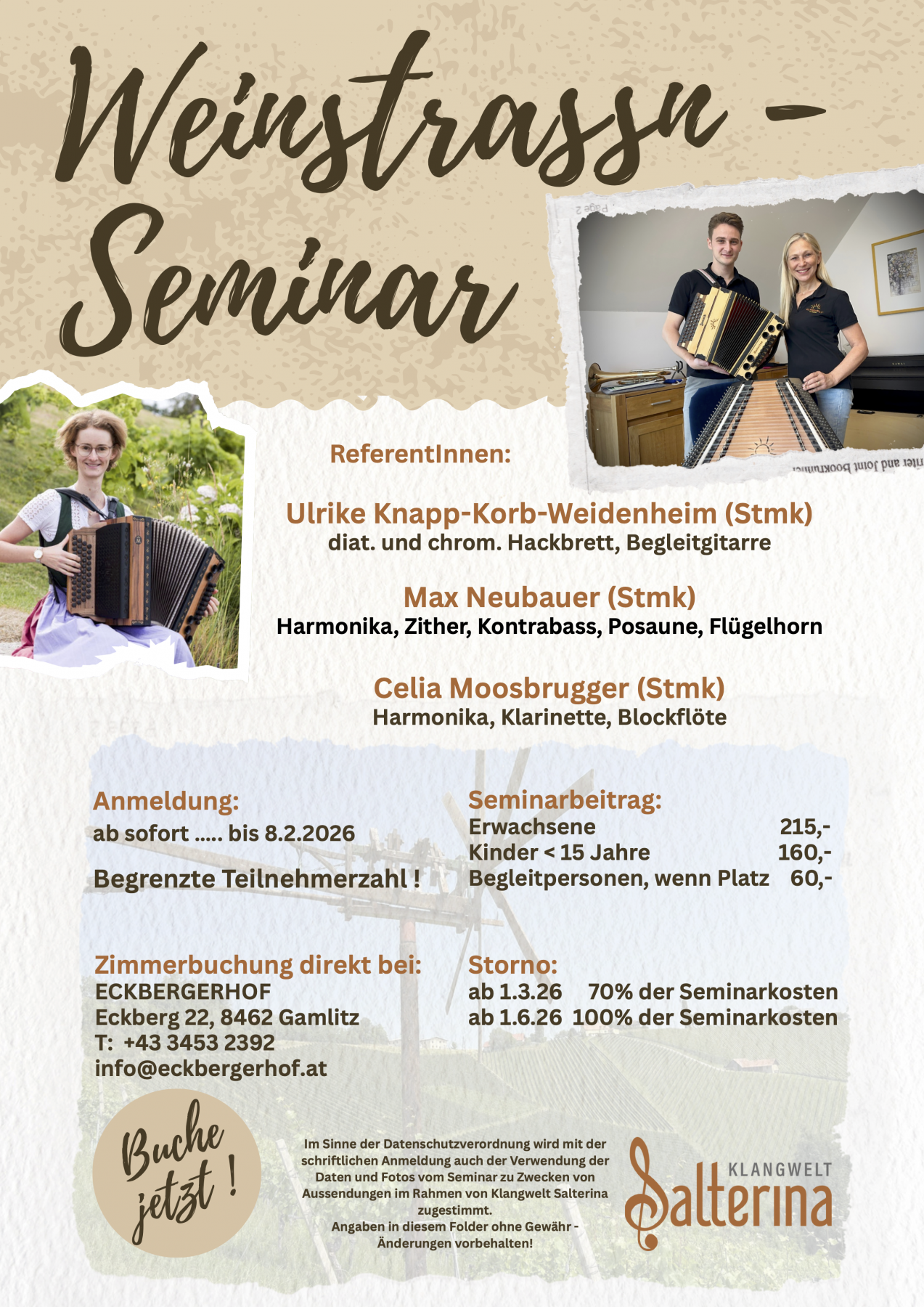 Genieße das Musizieren mit anderen Musikbegeisterten, die tolle Landschaft und ein Glas guten südsteirischen Wein.