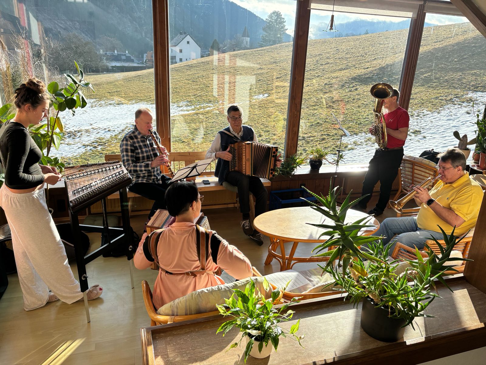 Noch mehr Teilnehmer als im Vorjahr kamen zusammen, darunter viele Jugendliche und auch Schnupperschüler. Menschen jeden Alters und jeder Erfahrungsstufe musizierten wieder in herzlicher, entspannter Atmosphäre miteinander. Diesmal war der Andrang nicht nur für Harmonika und Blasinstrumente groß, sondern auch für die Saiteninstrumente wie